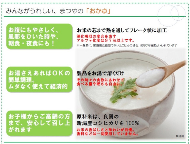 ここは空白です フレーク状の粒なしタイプで、お腹に優しく、赤ちゃんから高齢の方まで、どなたでも食べられるやわらかおかゆです。