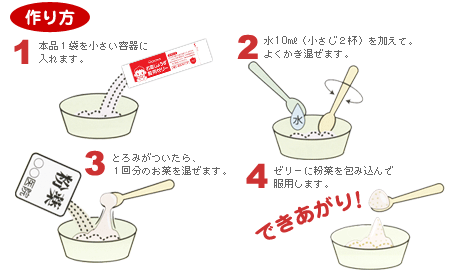 にがい粉薬を包み込んで、飲みやすくするいちご風味の服用ゼリーです。1回ずつ使いきりの分包タイプだから、衛生的にご使用いただけます。