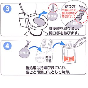 • 既存のトイレ、またはダンボール等の便器に排便袋をかぶせ、用を足す。