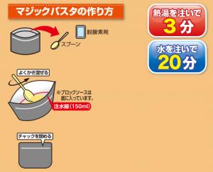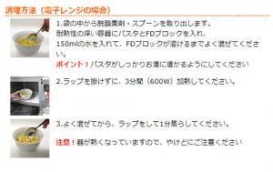• 袋の中から脱酸素剤・スプーンを取り出します。耐熱性の深い容器にパスタとFDブロックを入れ、150mlの水を入れて、FDブロックが溶けるまでよく混ぜてください。