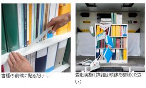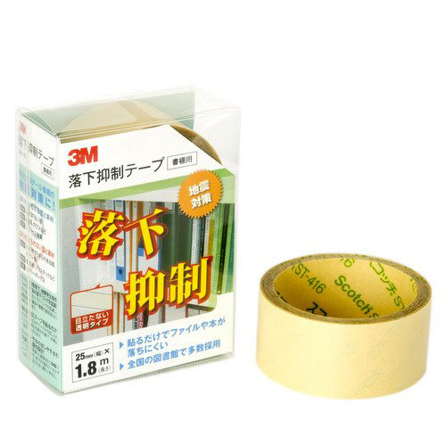 - テープを書棚の前端に貼るだけで地震によるファイルや本の落下リスクを低減します