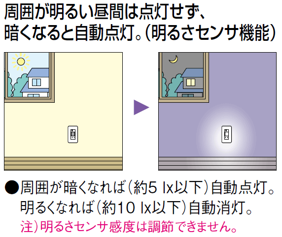 明るさセンサ動作照度 点灯約5lx以下、消灯約10lx以下