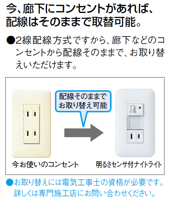 • 2線配線方式ですから、廊下などのコンセントから配線そのままで、お取り替えいただけます。