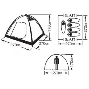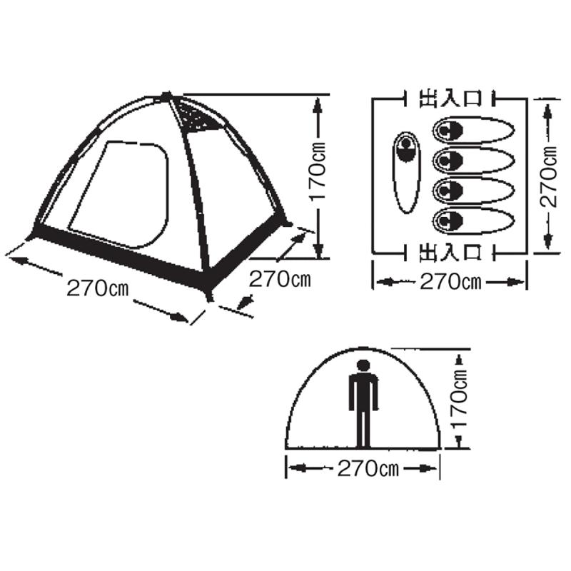 | 材質(品質) | フライ:ポリエステル(PU加工・防水)、インナーテント:ウォール=ポリエステル(PU加工・防水)、グランドシート=PEクロス、メッシュ=ポリエステルノーシームメッシュ、メインポール・センターポール:φ11mmグラスファイバー |