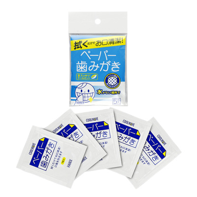 「ペーパー歯みがき」は、歯ブラシや水がなくても、拭くだけで簡単に歯を清潔にできるので、被災地はもとより、急な停電による断水などで歯みがきができない場合に大変便利です。
