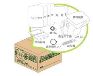 ・アルファ化米×4 ・具材×2 ・調理用袋×1 ・調理用バンド×1 ・衛生用手袋×2 ・しゃもじ×1 ・弁当容器×50 ・割り箸(楊枝入)×50 ・輪ゴム×50 ・調理説明書×1 |
