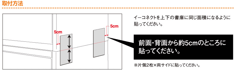 施工方法 段積みには左右4ヵ所、左右連結には上部に2ヵ所、2つの書庫のつなぎ目に貼る。
