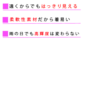 ●遠くからでもはっきり見える。 ●柔軟性素材だから着易い。 ●雨の日でも高輝度は変わらない。 ナイロンメッシュ・プリズム式反射テープ