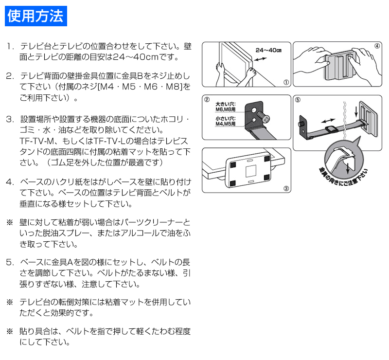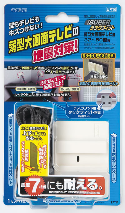 テレビ背面(ベルトはテレビ背面の壁掛用ネジ穴に固定してください。)とスタンド(スタンドの四隅にはタックフィットを使用してください。)の上下固定で大きな揺れにも安心です。