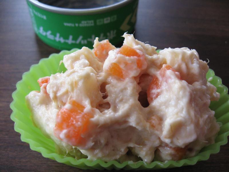 原材料名 野菜(じゃがいも(国産)、にんじん)、マヨネーズ、まぐろ水煮(まぐろ、食塩、野菜エキス)、砂糖、オニオンソテー、チキンブイヨン、小麦粉、食塩、香辛料/加工デンプン、 調味料(アミノ酸等)、安定剤(キサンタンガム)、酸味料、香辛料抽出物、(一部に小麦・卵・大豆・鶏肉を含む)