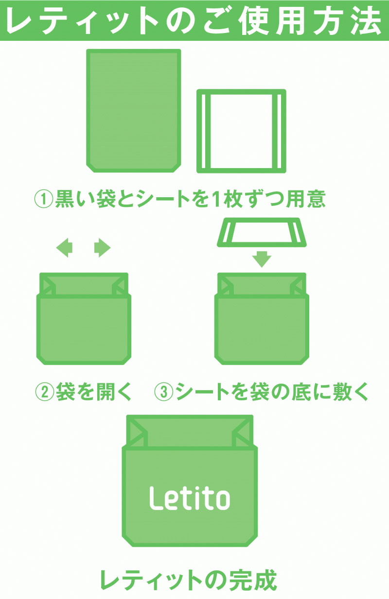 | ・ | 便袋を広げて、吸水シートを入れるだけで、すぐに使用ができます。 |