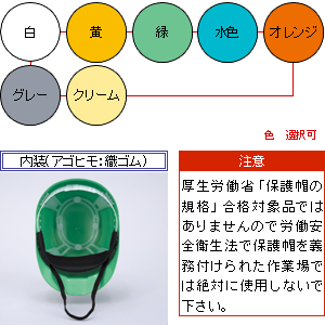 厚生労働省「保護帽の規格」合格対象品ではありませんので労働安全衛生法で保護帽着用を義務付けられた作業場では絶対に使用しないで下さい。