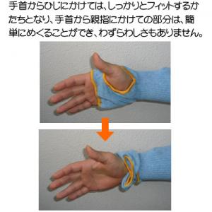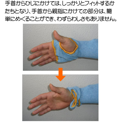 - 手首からひじにかけては、しっかりとフィットするかたちとなり、手首から親指にかけての部分は、簡単にめくることができ、わずらわしさもありません。