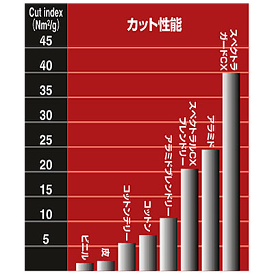 スペクトラガードCX工学紡績糸はグローブのためのコットンのしなやかさと、スペクトラガード技術のカット抵抗の性能を組み合わせています。使いやすさを提供する一方で、スペクトラCXで作られたグローブは、アラミド繊維で作られたグローブに比べて2倍のカット抵抗があります。スペクトラCXは現在の最新技術である防弾ベストの材料であるスペクトラ繊維も含んでおります。非常に強く軽量のスペクトラ繊維は、鉄の10倍、アラミド繊維の1.4倍以上の強さがあります。スペクトラガードCXは漂白剤を含む化学薬品に対して抵抗力が有ります。