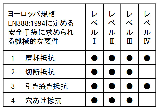 - 防災・安全手袋レベル?は、ヨーロッパ規格EN388:2004 に定める安全手袋に求められる機械的な要件(Mechanical Requirements)にて、引き裂き抵抗(Tear Resistance)、耐摩耗性(Abrasion Resistance)で、レベル?を習得した高級安全手袋です。