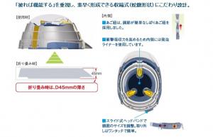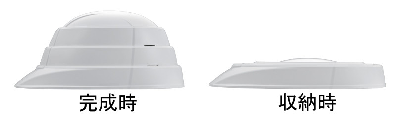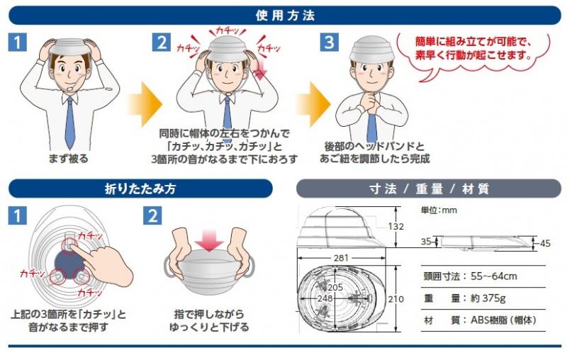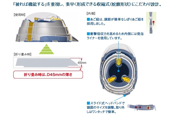 ここは空白です 折りたたんだ時に薄くなる!収縮式の防災用ヘルメットです。