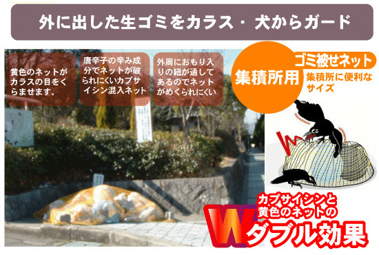 トウガラシより辛い!激辛カプサイシン入りの糸で作ったごみネットです。 生ごみや生活ごみを、カラスの被害から守ります◎
