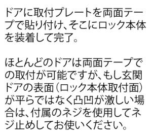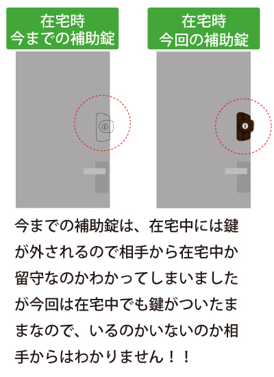 | 扉やカベに穴をあけずに防犯、賃貸住宅にも最適! 付けたままだから相手に対して在宅・不在の判別がつかない! アンチピッキングピン採用のキー違い200万通りで、簡単に1ドア2ロックが可能です! 取り付けも、工具不要で簡単に取り付けができます。 サムターン廻しや、ピッキング、カム送り不正解錠対策に・・・ 非常脱出機能が付いているのでいざという時も安心です。 |