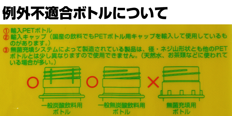 - 無菌充填システムによって製造されている製品は、径・ネジ山形状とも他のPETボトルとは少し異なりますので使用できません。(天然水、お茶類などに使われている場合が多い。)