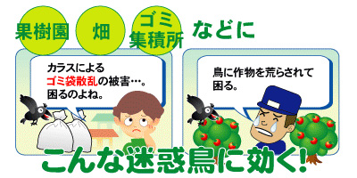 都市のゴミ置き場、畑・果樹園等、カラスの被害でお困りの場所に、吊るすだけ!
