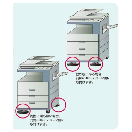 • コピー機などのキャスター付重量機器に取付け、適度なブレーキをかけることにより、地震等による暴走・転倒を防止します。