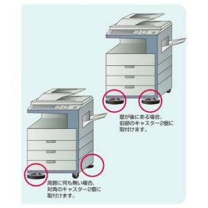 • 製品は2個1セットで、機器の4個のキャスターのうちの対角の2個または前面の2個に取り付けて使用します。