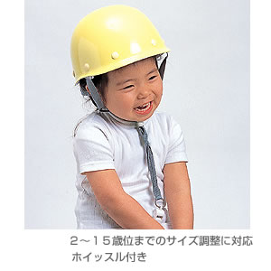 あごひもの先にホイッスルの付いた子供向け防災専用ヘルメット。