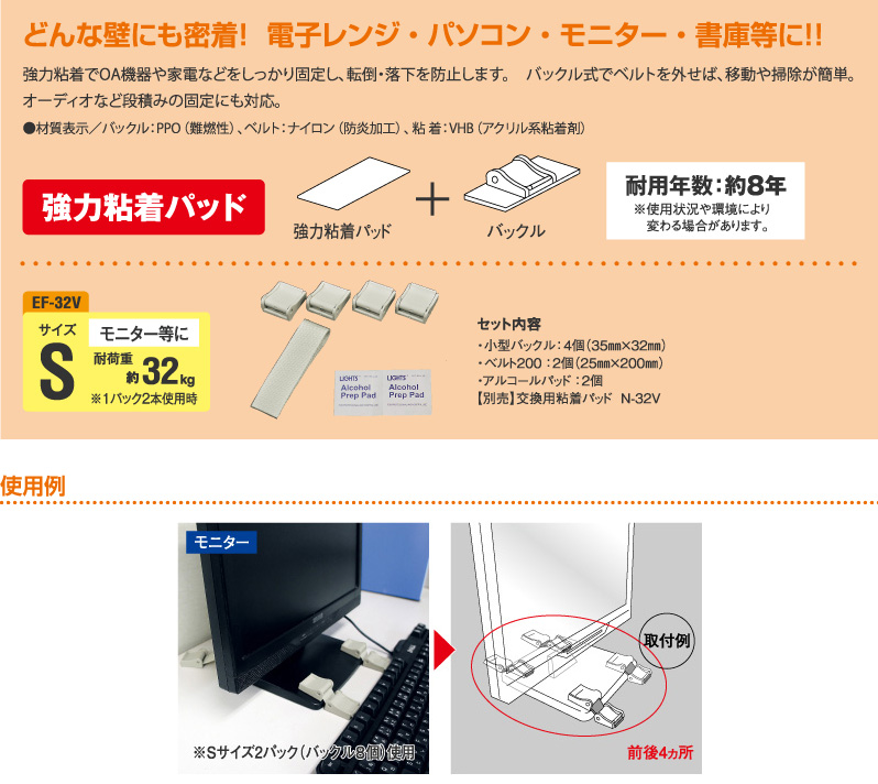 | 材質 | バックル:PPO(難燃性)、ベルト:ナイロン(防炎加工)、粘着:VHB(アクリル系粘着剤) |