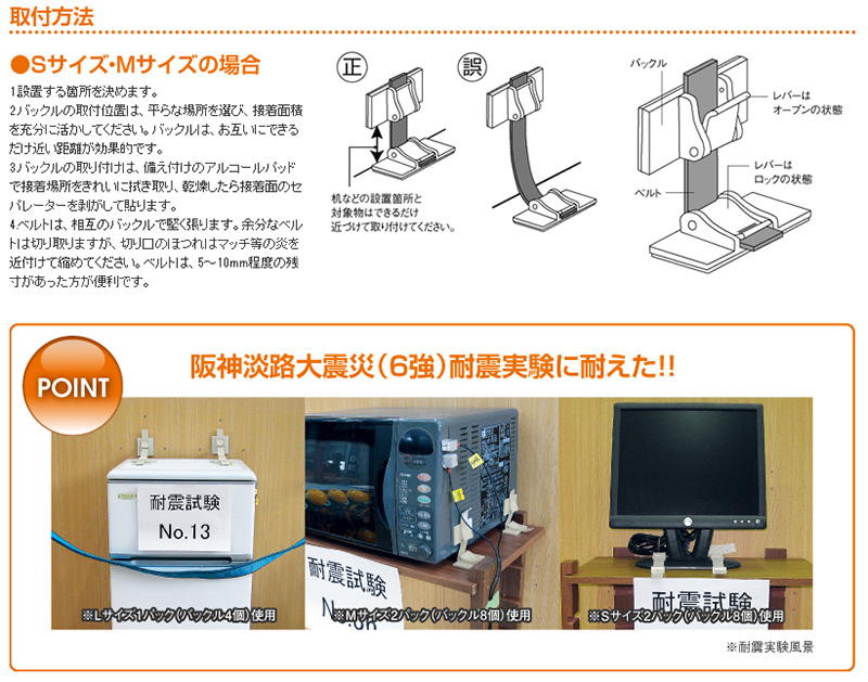 | 施工方法 | 設置面と機器にバックルを粘着固定。ベルトで調節し、止める。 |