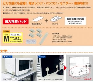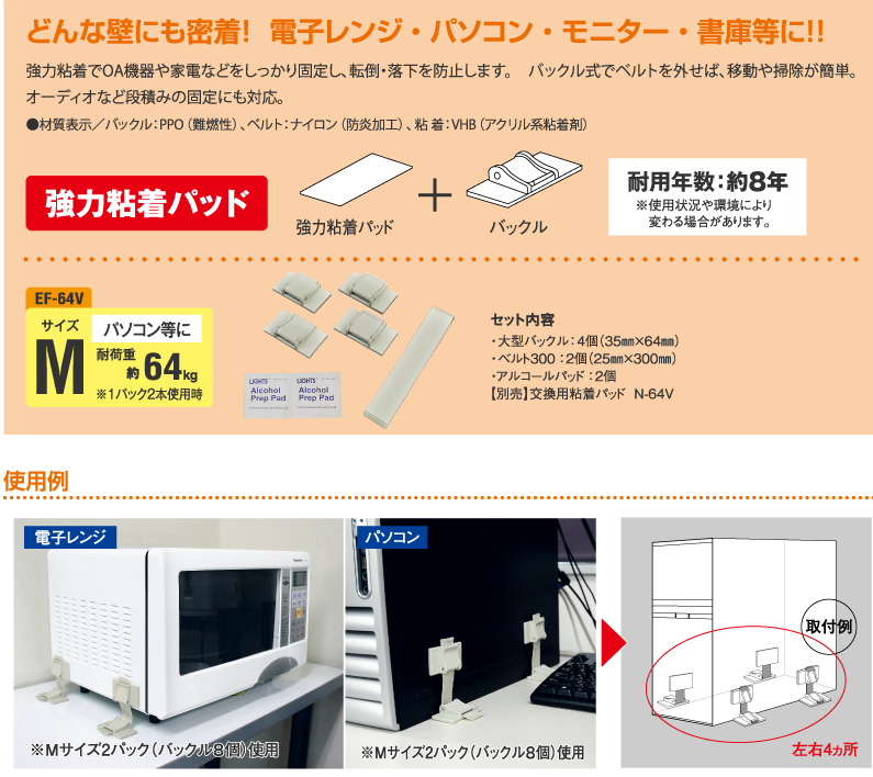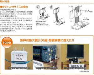 | 施工方法 | 設置面と機器にバックルを粘着固定。ベルトで調節し、止める。 |