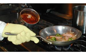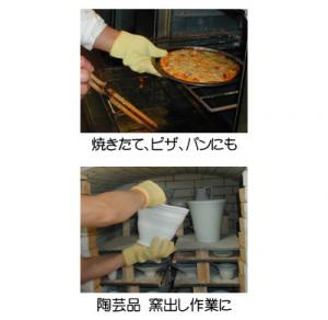 手袋は二重構造となっており、外部には、耐熱、耐刃に優れたケブラー素材にて熱遮断バリアを形成し、内部層のニット綿にて熱伝導を遅くします。直火に直接ふれた場合でも、手袋の外側の層には火が燃え移りにくく、しかも溶けにくいため、安心して使用することが可能です。