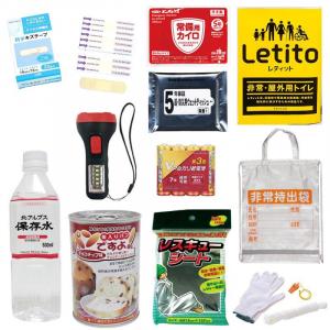 | 内容 | 非常用持出袋×1枚、レスキューシート×1枚、ウェットティッシュ×1袋、軍手/ロープ/笛×1セット、カイロ×1枚、絆創膏×1箱、非常・屋外用トイレ(1枚入)×1個、LEDライト×1本、単3形乾電池(4本)×1組、保存水(500ml)×1本、パンの缶詰(チョコチップ)×1缶 |