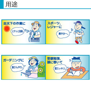 • 猛暑炎天下、首筋や頭に心地よい冷感を与え、運動、冷湿布に最適です。