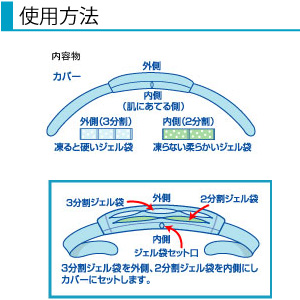• 内側のジェル袋は冷たく柔らかく、外側のジェル袋は凍って硬くても3分割の為首筋や頭、脚にフィットします