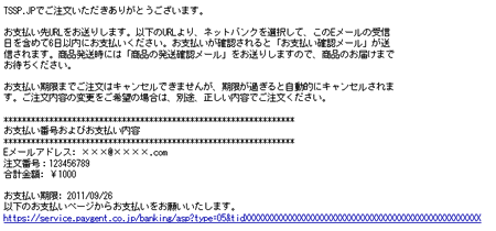 宛先・会計の支払方法でネットバンキングを選択し、注文を確定します。 「ご注文の確認メール」をお送りします。 この時点ではお支払い番号は発行されません。 2.お支払いページのご案内 「お支払い先お知らせメール」をお送りします。 ※サンプルメール ![]() 3.お支払い 「お支払い先お知らせメール」のURLからご利用のネットバンクをご選択のうえ、お支払い期限内にお支払いください。 お支払い期限を過ぎるとご注文は自動的にキャンセルされます。お支払い確認後には、「お支払い確認メール」をお送りします。 ※提携金融機関の画面操作については、各金融機関によって手続画面が異なりますので、各金融機関のホームページ等でご確認ください。 ※携帯電話でのご利用については、提携金融機関により、ご利用できる携帯電話会社や機種が異なります。事前にご利用の提携金融機関にご確認ください。 |