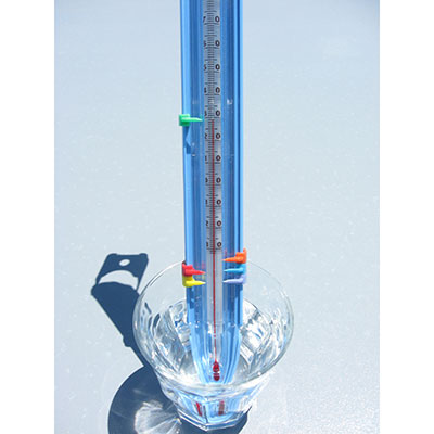 試しに、日光を当てて温めた「レスキューウォーター」の温度を測ってみました。
