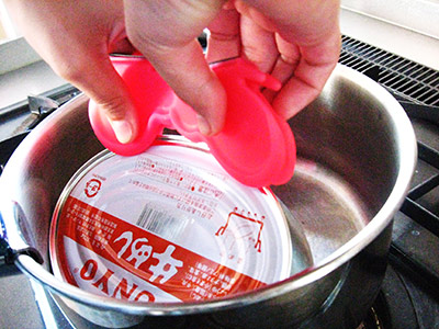 こちらの商品は、缶を開けずに熱湯の中で20分ほど温めます。