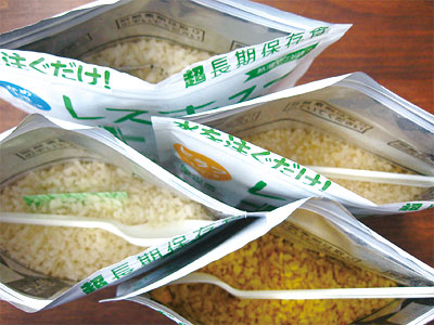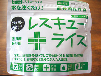 7 年保存が可能なアルファ米。 その名も「レスキューライス」