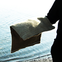 吸水前のアクアブロックは、約400g重さがありますが、吸水後の重さは約20kgと、約40倍になります!!ちょっと持ってみると、ズッシリとした重量感があり、見た目以上に重かったです。アクアブロックの中には高吸水性ポリマーというものが入っています。それが水を含んでゲル上にふくらみます。写真のように、端を持って持ち上げても、そのポリマーが麻の隙間から漏れてくることはありませんでした。また、この高吸水性ポリマーと麻は環境に優しいので、アクアブロックごと海や川の水にそのまま浸してしまっても大丈夫です。安心してご使用ください。