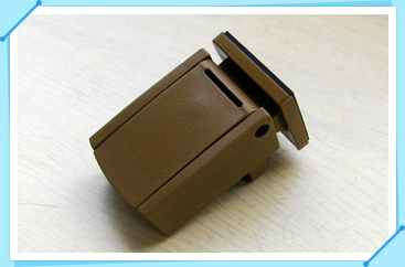 市販されている窓ロックと同じ位の大きさで強化プラスチック製。色は黒と茶色。