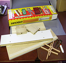 木製の板が5枚(ツッパリ天板、前板、側板2、背板)、調整羽(ハンドル)が2つ、アジャスターナットが2本、そして木工用ボンド。